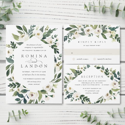 Nosso convite para o casamento de White Peony rodeia seus detalhes do dia do casamento com um quadro redondo de cor d'água verde pintada, folhagem botânica, rosa branca e flores de peônia, colocados no centro superior esquerdo para uma nova aparência moderna.