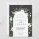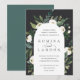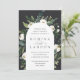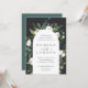 Nosso convite para o casamento de White Peony rodeia seus detalhes do dia do casamento com um belo arco de cor d'água pintada verde, folhagem botânica, rosa branca e flores de pénia.