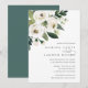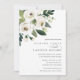 Nosso convite para o casamento da White Peony apresenta um buquê de coloração d'água pintada verde, folhagem botânica, rosa branca e flores de pénia. Personalize com seus detalhes de casamento em letras clássicas, alinhadas no canto inferior direito.