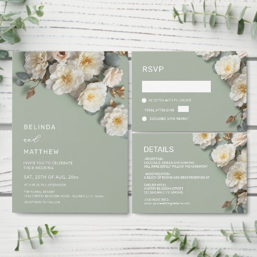 This elegant wedding invitation features textured white yellow roses on a white background with first names only.