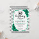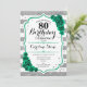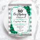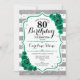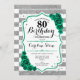 Convite de aniversário 80. Elegante design verde esmeralda floral com rosas. Funciona com linhas cintilantes prateadas e brancas e letra de script. Perfeito para uma comemoração de dia das mulheres na moda. Pode ser personalizado para qualquer idade! Impressos convites Zazzle ou modelo de impressão digital instantânea para download.