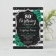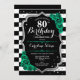 Convite de aniversário 80. Elegante design verde-esmeralda floral com prata brilhante e rosas. Apresenta faixas pretas e brancas e fontes de script. Perfeito para uma comemoração de dia das mulheres na moda. Pode ser personalizado para qualquer idade! Impressos convites Zazzle ou modelo de impressão digital instantânea para download.