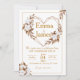 A minimalist white wedding invitation featuring an elegant thin heart, delicate white roses, and soft brown branches.