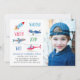 Um convite de aniversário de criança com Rocket, avião, helicóptero.