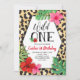 Um divertido e exótico convite para o primeiro aniversário com um fundo de impressão de leopart e um quadro geométrico divertido. O convite inclui folhas tropicais e flores de hibisco vermelhas e cor-de-rosa com a frase "Wild One".
