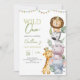Celebre o grande dia do seu filho com este Convite de Aniversário de Um Garoto Selvagem. Apresentando uma pilha adorável de animais safari incluindo um leão, zebra, hipopótamo, girafa e elefante. Cercado por folhas da selva e uma faixa festiva pastel se estende pelo topo. Esta design lúdica e encantadora é perfeita para um safari, selva ou festa de aniversário selvagem de animais. BRT344