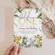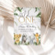 Um convite para o primeiro aniversario selvagem com animais safari fofos e folhas tropicais vibrantes - Leão, Elefante, Zebra, Girafa.