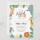 Celebrate the mom-to-be with this adorable “A Little Wild One”safari baby shower invitation! Featuring playful safari animals — a monkey, giraffe, elephant, zebra, and lion — surrounded by lush green leaves. Perfect for a wild one baby shower theme, this design adds a fun and adventurous touch to your celebration. Personalize with your event details for a sweet and stylish safari themed invitation.