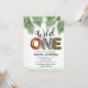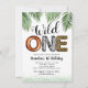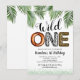 Convites de festa de 1º aniversário Safari com fundo branco simples, brilho verde, folhas de palmeira da selva tropical, a frase "wild one" em diferentes impressões de animais e um modelo de celebração que é fácil de personalizar.