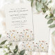 The background is a soft beige or ivory on both sides, with the text in elegant dark gray fonts. Handwritten script blends with modern serif typography for a clean, contemporary feel. The muted floral palette complements a variety of wedding styles, from rustic outdoor gatherings to chic metropolitan events.