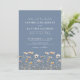 The background is a rich dusty blue or periwinkle on both sides, with the text in elegant dark gray fonts. Handwritten script blends with modern serif typography for a clean, contemporary feel. The muted floral palette complements a variety of wedding styles, from rustic outdoor gatherings to chic metropolitan events.