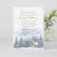 The front features a serene watercolor winter scene with a brown log cabin nestled at the bottom, surrounded by soft green pine trees and blanketed in crisp snow. The clean white sky above leaves plenty of room for your event details in a modern, easy-to-read layout. The overall look is tranquil and elegant, blending rustic charm with seasonal warmth.