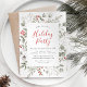 Convite de festas elegante com detalhes de seu partido, enquadrados em branco com um fundo de groselhas de cor-d-água vermelha, folhas de eucalipto e folhagem verde-esgueirada. Personalize a frente dos convites de festas botânicos de Natal com os detalhes da sua festa.
