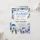 Convites de festas de natal de primeiro aniversário com fundo de cinza lavado, flores e folhagem elegantes de Natal, pinguins de bebê bonitos, bonitão, presentes e um elegante modelo de primeiro aniversario personalizado que é fácil de personalizar.