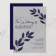 Estes elegantes convites para o casamento apresentam uma design rustica, mas moderna, com ranhuras de folhas de marinho azul-aquarela pintadas à mão, entrando de ambos os lados da carta em fundo de cinza. A tipografia é única e elegante, com textos justificados tanto à esquerda como à direita. Simples e na moda, estes convites são uma maneira maravilhosa de incluir sua família e amigos em seu dia especial.