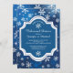 Bonito convite de janto de ensaio, com flocos de neve brancos, sobre fundo azul. O ensaio perfeito janta convites de festas para um chá.