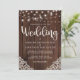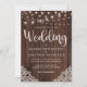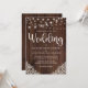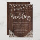 Wood Rustic and String Lights Lace Wedding Invitation com fundo de madeira rústica com cordas cintilantes de luzes e rendas de estilo vintage nos cantos inferiores. A palavra casamento é lançada em uma elegante mas rústica tipografia, fazer este é o design perfeito para o seu casamento de vovô ou de campo.