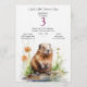 A charming watercolor illustration of a cute little beaver sitting by a peaceful stream, surrounded by soft wildflowers. With its bright eyes and fluffy fur, this friendly woodland character brings a warm and joyful atmosphere—perfect for celebrating a child’s special day in a nature-themed, gentle, and whimsical style.