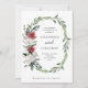 Este simples e elegante convite para o casamento de feriado apresenta uma coroa na moda, aquarela, feita de verde moderno e flores vermelhas e brancas de Natal em fundo branco.