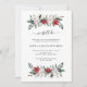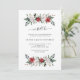 Esta festa de aniversário de casamento simples e elegante ou o convite para renovação de votos contém buquês na moda, de aquarela, feitos de verde moderno e flores de Natal vermelhas e brancas, em fundo branco. A caligrafia diz "ainda fazemos". A parte de trás do convite apresenta uma na moda, coroa de Natal correspondente.