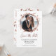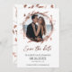 Um casamento simples e elegante Salve o cartão de Data com coroa floral chic e design de folha de ouro rosa que é fácil de personalizar com seus detalhes. O cartão tem um estilo moderno, caligrafia personalizável, letra escrita à mão e convite para o casamento de fotos de coroa.