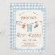 Xadrez Blue Clothesline Western Rodeo Convite para primeiro aniversario Cute Western ou rodeo no primeiro convite de aniversário para um bebê com um padrão de gingham azul na frente com um quadro de estilo de corda e texto editável e uma linha de roupas com itens de cowboy. O verso deste convite apresenta o padrão de gingham.