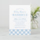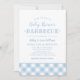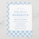 Convite moderno para chá de fraldas para um evento casual de CHURRASCO de quintal em cores azul pálidas e brancas com uma borda de xadrez de toalha de gingham com padrão. Perfeito para um casal esperando um bebê!
