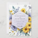A delicate watercolor design features a vibrant mix of golden yellow blooms and soft violet blossoms, accented with wispy greenery. The artistic composition evokes a whimsical, natural feeling for a special day.