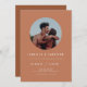 Este convite para o casamento apresenta um sans serif font duo, um moderno design minimalista e uma fotografia redonda personalizada com uma combinação moderna de cor laranja queimada de terracota boêmica. Este convite de casamento é perfeito para o seu casal minimalista favorito. Edite facilmente a foto e adicione seu site de casamento (e/ou código QR na parte traseira). ADICIONANDO UM CÓDIGO QR: ・ VISIT goqr.me ・ Digite seu site e faça o download como um arquivo SVG. ・ Arraste e solte o arquivo SVG na seção 'imagens'. ・ Clique no seu código QR com o Solteiro e ele será pop. Mude a cor, ajuste a escala e mova-a.