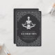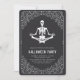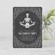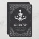 Um convite para festas de Dia das Bruxas chique assustador com um esqueleto amoroso de yoga em lotus pose. Personalize com os detalhes da festa de Halloween.