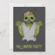 Design do cartão de convite para festas do Halloween que apresenta a ilustração assustadora de desenho animado de Destei de um caractere zombie verde em uma cor de fundo da cinza escura (a cor de fundo pode ser alterada para qualquer outra cor também). O zumbi tem um pouco de seu cérebro visível, seus braços estão levantados e ele tem um bastão de madeira marrom preso em sua cabeça. Personalize as áreas de texto com os detalhes do seu evento.