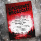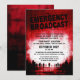 Zombie temeu o convite da festa do Dia das Bruxas com as palavras "transmissão de emergência" em letras cintilantes em um fundo vermelho, branco e preto com silhuetas e formas de zombie. Adicione o texto do convite abaixo.