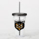 Esta bebida acrílica tropeçando com palha e tampa tem na frente e atrás a cabeça de um vintage gato preto de Halloween com sotaque laranja e branco em sua face sorridente.