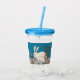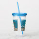 Esta bebida acrílica que cai com palha e tampa tem um coelho branco liso sentado no chão entre flores brancas e laranja sobre fundo azul.