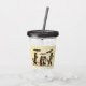 Esta bebida acrílica que cai com palha e tampa tem dois gatos marrons andando com dois gatinhos todos segurando guarda-chuvas na neve caindo sobre um fundo amarelo.