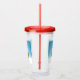 Tumbler acrílico com um design bonitinho e caprichoso apresentando um adorável pinguim vestindo um chapéu de santa vermelho. Ficando atrás de um buquê de flores com canas doces listradas cor-de-rosa e branca. Um fundo de inverno nevado com flocos de neve caindo.