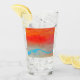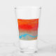 Um design abstrato de um pôr do sol oceânico com cores ousadas em vermelho, laranja, ciano, azul e bege.