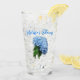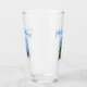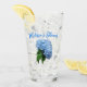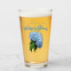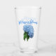 Cama azul de hydrangea, recorte a imagem floral em um vidro transparente. O bebendo de vidro alto tem a imagem floral em ambos os lados. Pétalas azuis claras e folhas verdes no topo de um caule curto.