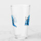 Este tumbler de vidro para bebidas tem um cartoon cartoon cartoon caricatura que tem um sorriso grande em seu rosto e concha é um padrão de azul claro e escuro de aqua na frente e atrás.