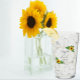 Design apresenta girassóis e folhas botânicas sobre uma imagem geométrica dourada impressa.