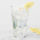 Um aglomerado de algas verdes e duas conchas de vieiras em um fundo azul faz um lindo vidro de bebendo com o tema do oceano. Perfeito para a casa de praia, ou para quem ama o oceano.