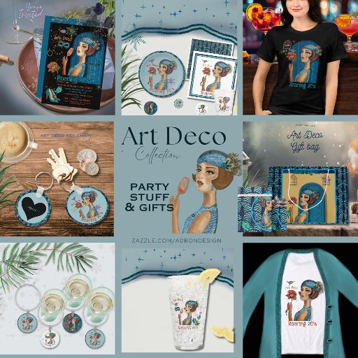 Veja este Design bonitinho com uma Mulher segurando um copo da Era Art Deco. Ela está vestindo um vestido azul lacrado e um chapéu com penas. Explore ainda mais a coleção para localizar mais itens de parte correspondentes. Esta design foi criada para o Partido da Véspera do Ano Novo, mas você pode jogar a festa da Arte Deco a qualquer momento.