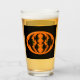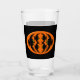 Este esplêndido tumbler de vidro apresenta um oval laranja com seis corvos. Cada corvo tem olhos amarelos com pupilas pretas e asas salientes. Os corvos voam em direção uns aos outros formando uma forma oval. O fundo é preto.