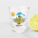 Cartoon de cacto sorridente com óculos de sol na paisagem desértica segurando uma caneca de cerveja e dando polegares para cima. Texto personalizado.