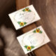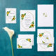 Design apresenta girassóis e folhas botânicas sobre uma imagem geométrica dourada impressa.