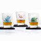 O design de vidro de tiro giro e chico é ideal para dar presente em qualquer ocasião como aniversários, celebrações, dias de as mães, a colegas de trabalho, ou como favores de noiva ou de casamento. Esta é uma coleção de três animais, um Hippo, uma Tartaruga, e um Flamingo. O estilo de aquarela é espetacular.