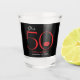 Moderno e sofisticado, este design de copo de shot de aniversário declara "ela tem 50" e combina preto e branco clássicos com sotaques de vermelho brilhante, com um par de lábios divertidos. Seu design minimalista é simples e divertido para celebrar o aniversário marcante. Criado por Simply Farmhouse Press.