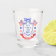 This patriotic bridal shower shot glasses features a watercolor crest with a light red white and blue patriotic crest with American flags and a blue bow. Text in the center of the crest says "Red, white and I do." You can personalize with your event date.