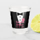 Copo de shot divertido para o noivo. Esmoquin preto com uma flor rosa na lapela, copos para personalizar com o nome do noivo e a data do casamento.