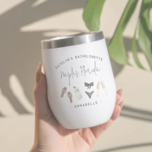 Inicie a festa com esses copos de shot fofos que são fáceis de personalizar para a despedida de solteira, ou fim de semana das meninas! O design boêmio de vinho country apresenta ilustrações delicadas em aquarela de sandálias, taças de champanhe, um coquetel misto e um maiô preto chique com letras de realce em cinza carvão. Personalize com três linhas de texto personalizado; mostrado com o nome da noiva, tipo de evento, local e nome individual.